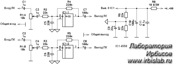 Резисторы R6 и R7 создают искусственную среднюю точку, имитирующую двуполярное питание ОУ. Напряжение в этой точке равно половине питания схемы. Конденсатор С9 нужен для стабилизации средней точки по переменному току. Коэффициент усиления схемы можно изменить резисторами R4 и R5 для левого и правого каналов соответственно. Конденсаторы С5 и С6 вместе с резисторами R2 и R3 образуют НЧ фильтры, которые фильтруют входной сигнал по высоким частотам, срезая радиопомехи и внешние высокочастотные шумы. Конденсаторы C1 и C2 вместе с сопротивлениями переменного резистора образуют ВЧ фильтр, который режет низкочастотные колебания - рокот двигателей магнитофонов, проигрывателей и другие низкочастотные помехи. Резистор R8 и конденсаторы C10 и C11 образуют фильтр питания микросхемы. Он подавляет пульсации источника питания.