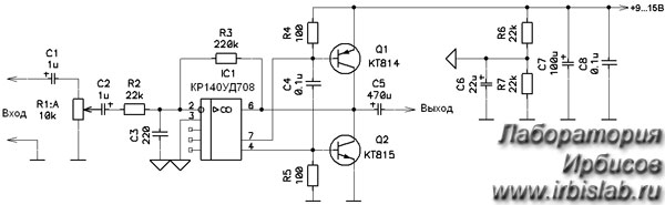 Следующая схема построена на ОУ с дополнительными транзисторами с токовым управлением. Смотрим на схему: