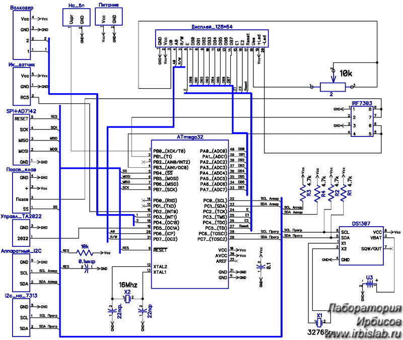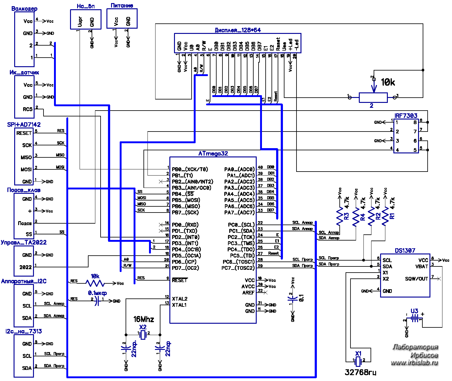 Схемы подобных устройств есть в Сети, но данный вариант имеет некоторые отличия: применён графический дисплей 128х64 на контроллере KS0108, предусмотрено подключение ёмкостной сенсорной клавиатуры на AD7142, в данный момент идет изучение даташита на вышеуказанный чип, тем не менее, устройством можно полноценно управлять с пульта ДУ и валкодера. Валкодер подходит как промышленный, так и сделанный из шагового двигателя от дисковода 5,25 дюйма. Подходят как шестипроводные двигатели, так и четырёхпроводные (промышленный валкодер пока не опробован, но если что – подкорректировать прошивку недолго).