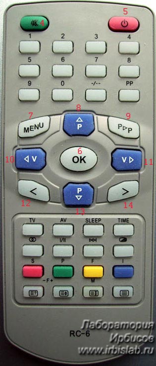 Оно предназначено для просмотра кодов отдельных клавиш вашего пульта с целью его адаптации под устройство. Зайти в это меню можно нажав на любом пульте, совместимом с системами команд дистанционного управления RC-5/6/7, последовательность кнопок: <красная> <синяя> <зелёная> <жёлтая>. Для выхода из данного режима необходимо 3 раза подряд нажать красную кнопку.