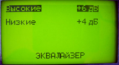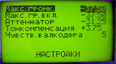 На рисунке 5 слева вверху – текущий номер входа и значения регулировок по ВЧ и НЧ, тонкомпенсации для него. Для каждого входа, а их 3, запоминаются свои значения, которые сохраняются в энергонезависимой памяти МК.