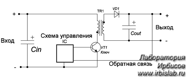 Ключ VT1 при замыкании накачивает энергию в первичную обмотку трансформатора, точнее, обратноходового дросселя TR1. При размыкании ключа магнитный поток в сердечнике мгновенно меняет направление, и на вторичной обмотке дросселя наводится ЭДС. Её можно регулировать, изменяя степень заполнения цикла (отношение открытого состояния ключа к закрытому). Выходное напряжение стабилизируется по сигналам обратной связи схемой управления как раз изменением степени заполнения.